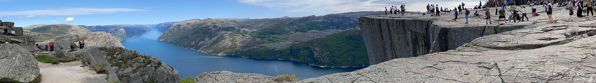 bis hin zum Highlight der Tour, dem Preikestolen, der berühmten Plattform in 600 mtr Höhe über dem Fjord, auf der die Mutigsten die Beine über die Kante baumeln lassen.